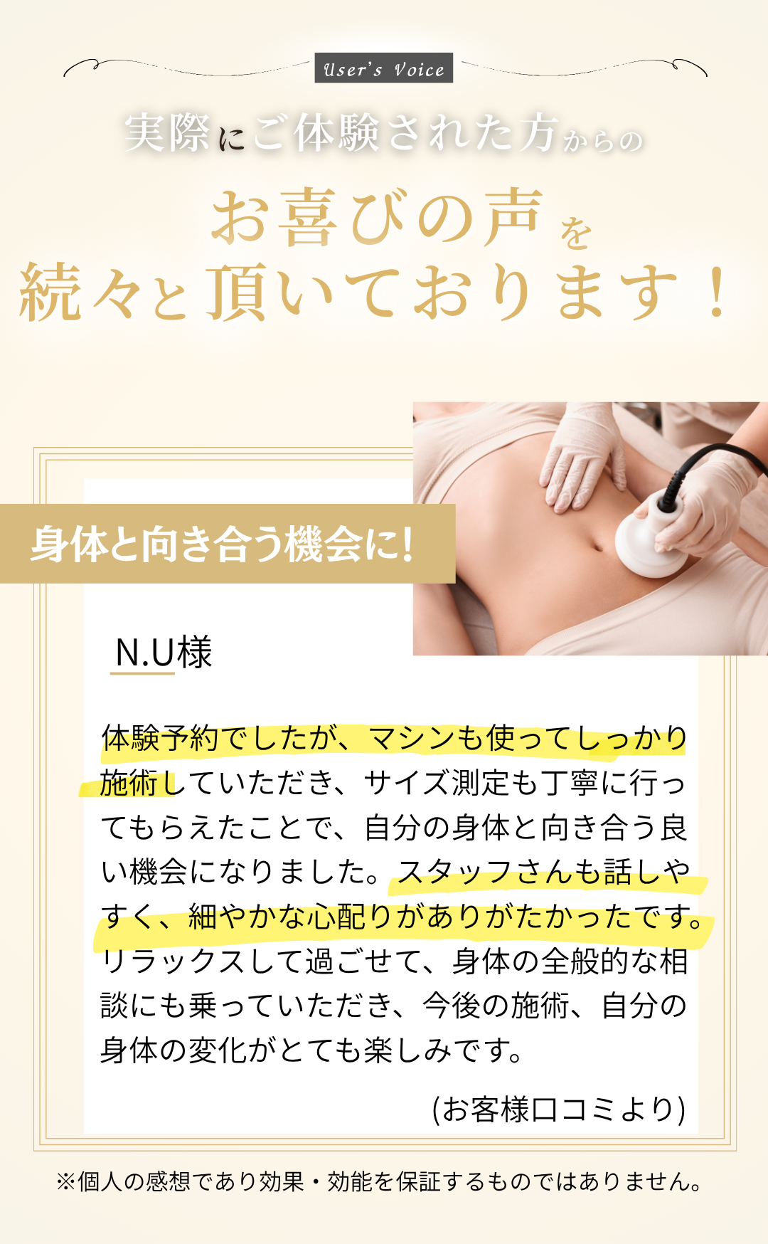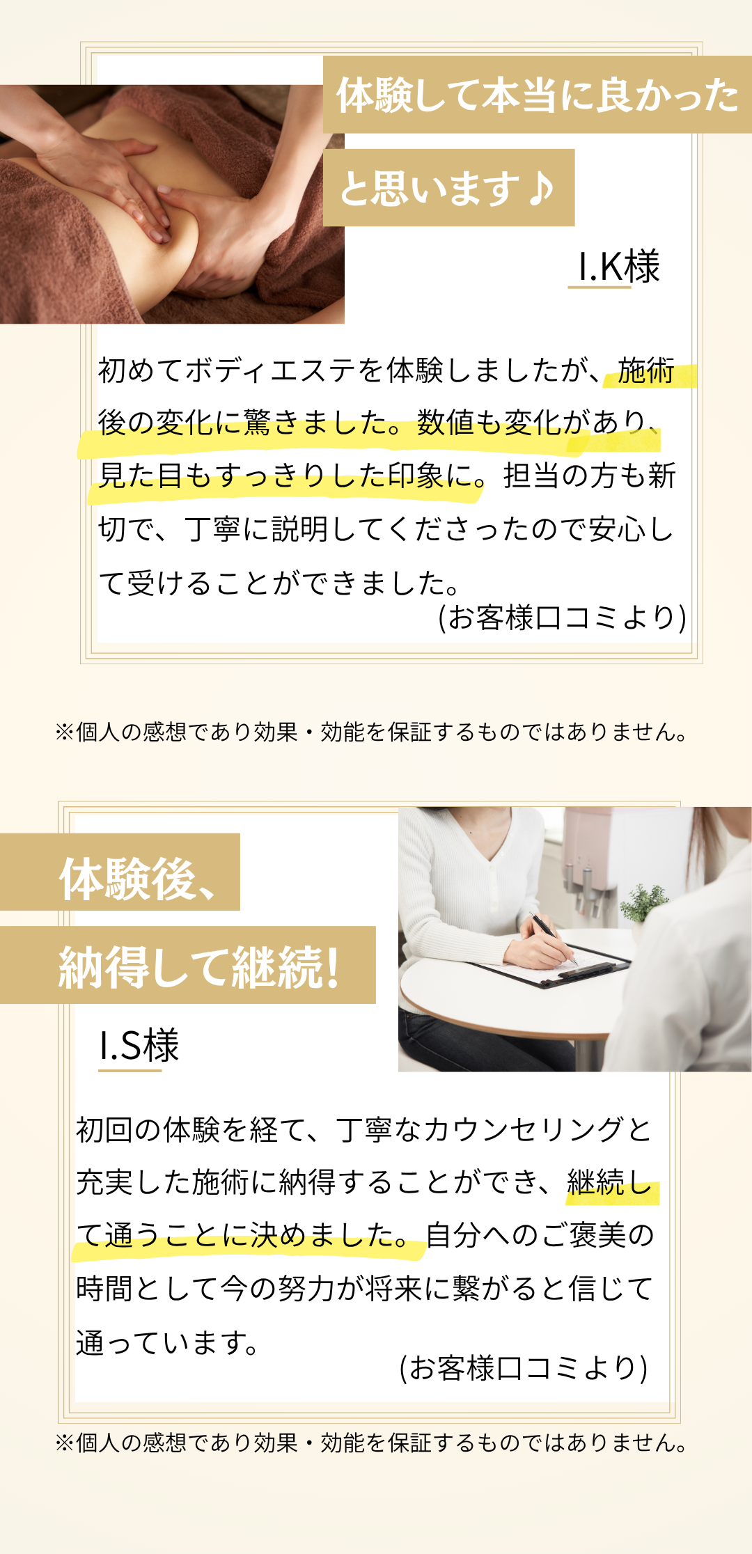 A. コースをお受けになった多くのお客様にご満足いただけるよう心がけておりますが、成果につきましては個人差がございますので、そのようなことも含めてキャンペーンコースをお試しいただきたいと思います。
